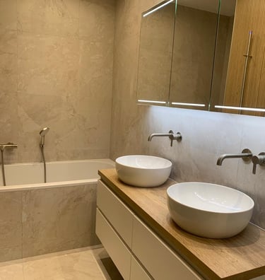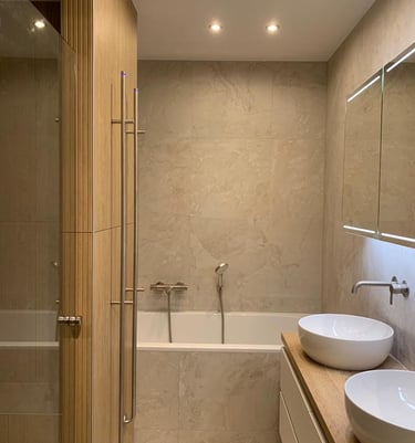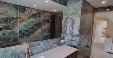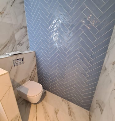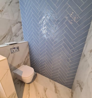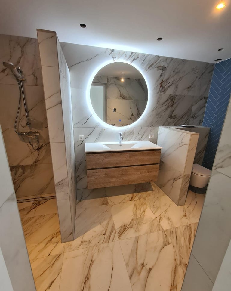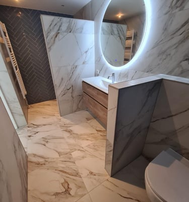 Onderdeel van een grotere renovatie is deze badkamer. Mooie luxe marmerren tegels en een leuke visgraat accentwanden.