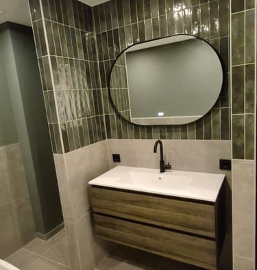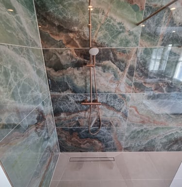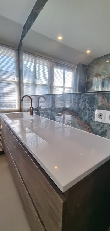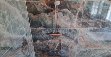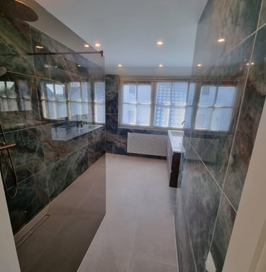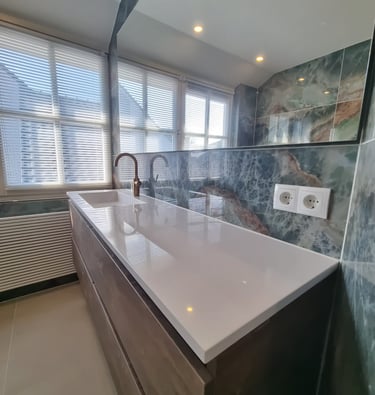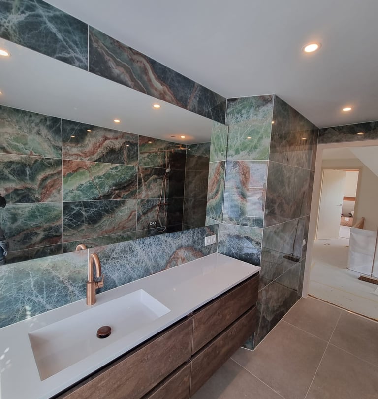 Groen Marmer en koperen kranen, deze badkamer is weer knap opgeleverd!