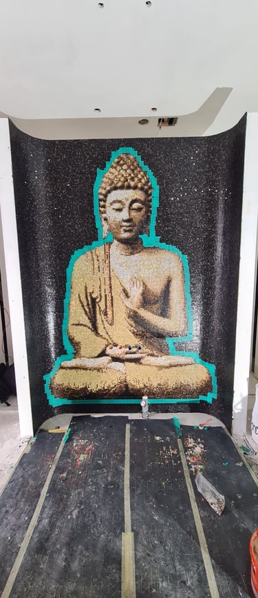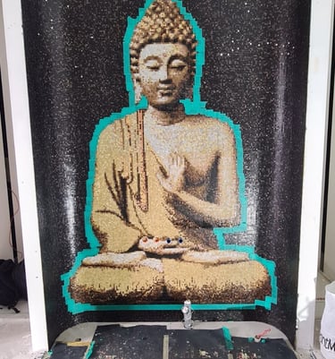 Onze eerste mozaïek klus van dit jaar is deze prachtige Budha van Milovito. In de Budha zitten twee sterrenbeelden gemaakt van swarovski kristallen.